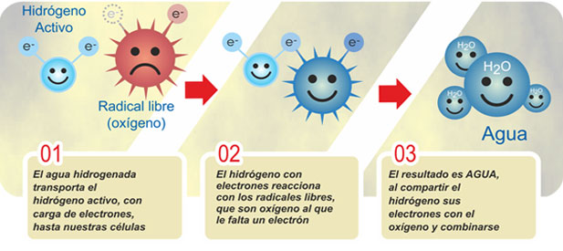 Hydrogen® inyecta electrones al agua, al inyectarle hidrógeno, aportándole carga eléctrica antioxidante. El agua enriquecida con hidrógeno dona sus electrones y neutraliza los radicales libres.
