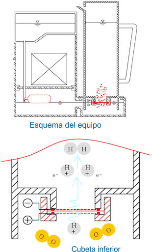1.- En la cubeta inferior se separa el hidrógeno del oxígeno por medio electrólisis, por la acción de los electrodos, que son dos rejillas de titanio con baño de platino, una conectada al polo positivo en contacto con el agua de la cubeta inferior, y la otra conectada al polo negativo en contacto con el agua de arriba, en la base de la jarra.